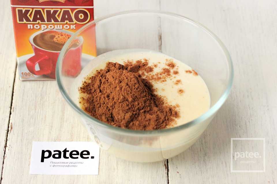 Отливаем в другую миску 250-300 мл теста и всыпаем в него какао-порошок.