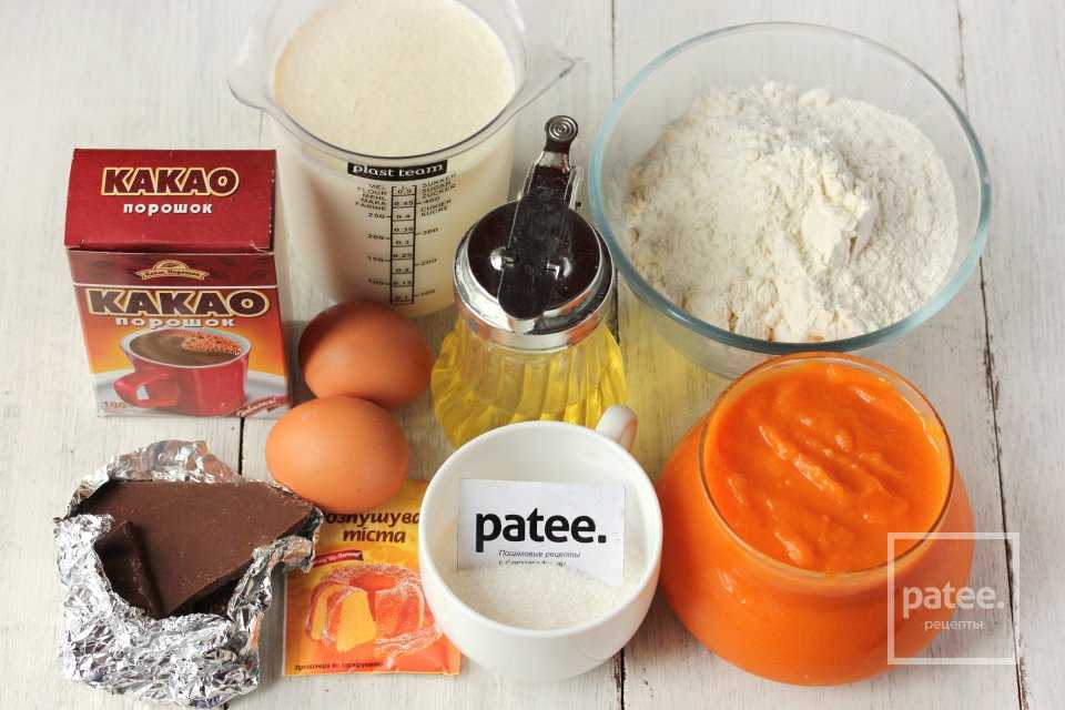 Для приготовления тыквенных блинов с шоколадной паутинкой нам понадобятся такие ингредиент: пшеничная мука, тыквенное пюре, куриные яйца, сахар, масло подсолнечное рафинированное, какао-порошок, молоко, разрыхлитель, чёрный или молочный шоколад.