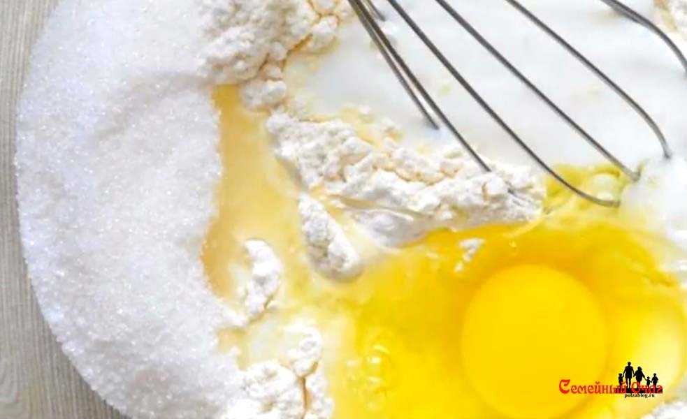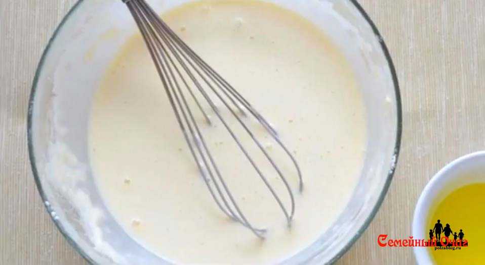 Яичную смесь взбить до образования легкой пены светло — желтого оттенка. Тогда тесто будет более воздушным, с множеством дырочек.