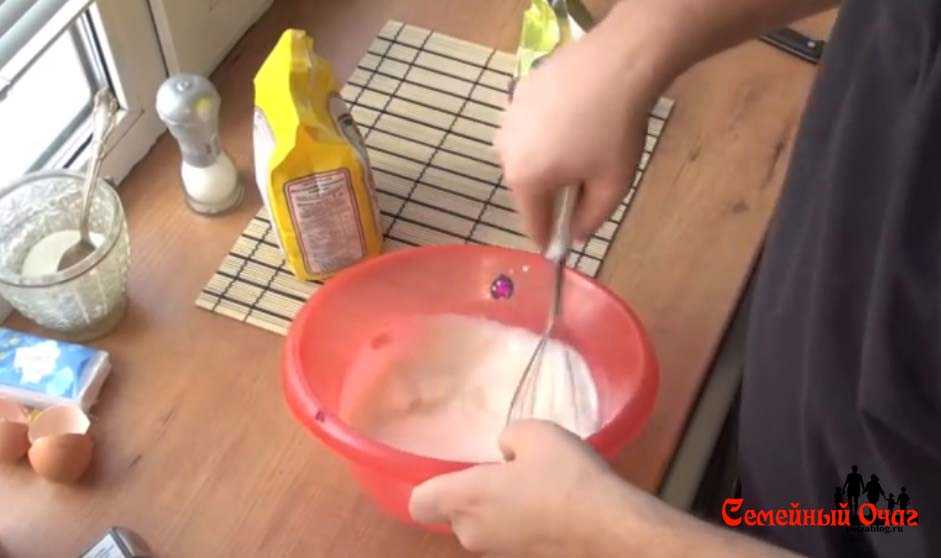 - Отдельно смешиваем яйца с сахаром, содой, солью, перемешиваем и оставляем на десять минут.