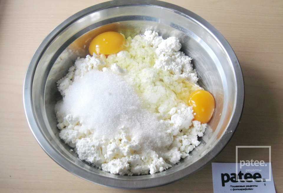 - В подходящей посуде смешать творог, яйца, немного соли. Размешать, разминая творожные комочки. Затем высыпать сахар и ванилин, хорошо перемешать еще раз.