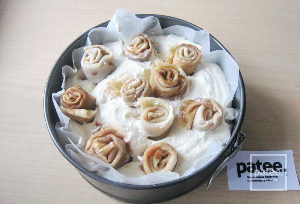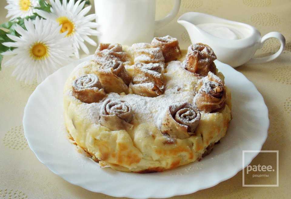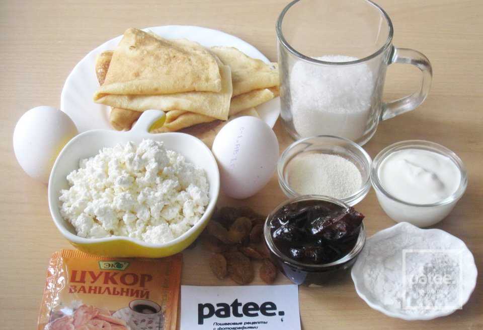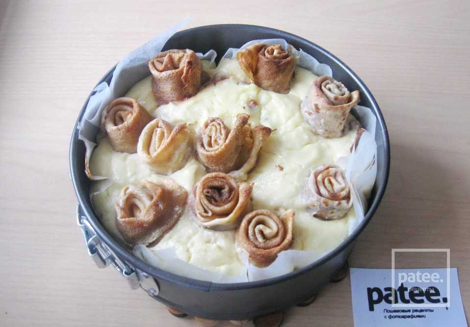 Вставляем блинчики с джемом вертикально в творожную массу. Отправляем форму в духовку, разогретую до 180 градусов С на 40 минут.