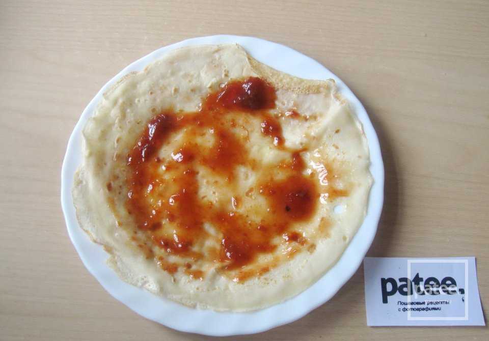 Приступаем к блинам. Каждый блинчик смазываем густым вареньем или джемом.