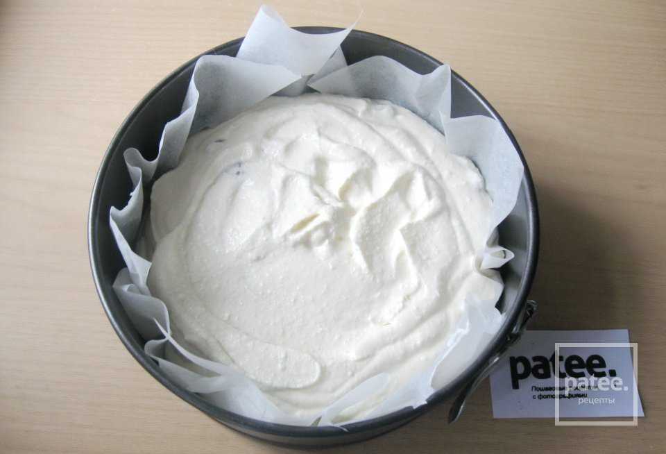 Форму для запекания выстилаем пекарской бумагой. Выкладываем творожную массу с изюмом. У меня диаметр формы 18 сантиметров.