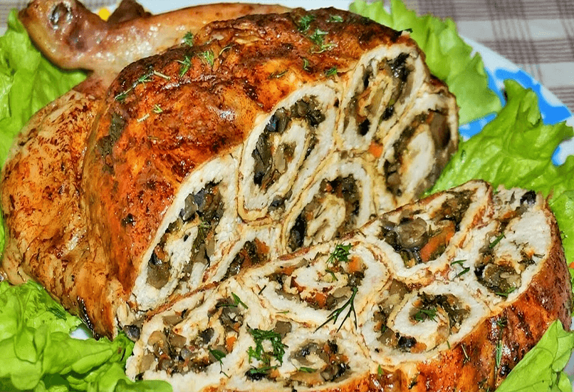 Приготовленная в духовке курица, фаршированная блинными рулетиками – это королевское блюдо. Конечно, нужно заморочиться, приложить все умения и старание, но результат вас порадует, и кулинарных комплиментов не избежать. Украсьте готовое блюдо ярким салатом и зеленью, чтобы оно выглядело еще эффектнее.