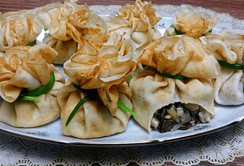 Мешочки, фаршированные грибами и курицей, отлично смотрятся на большой красивой тарелке в центре стола. Это необычное и красивое блюдо по сути очень простое. Напечем блинов на кефире или по классическому рецепту, приготовим вкуснейшую начинку, а мешочки завяжем перьями зеленого лука или нитями сыра чечил.