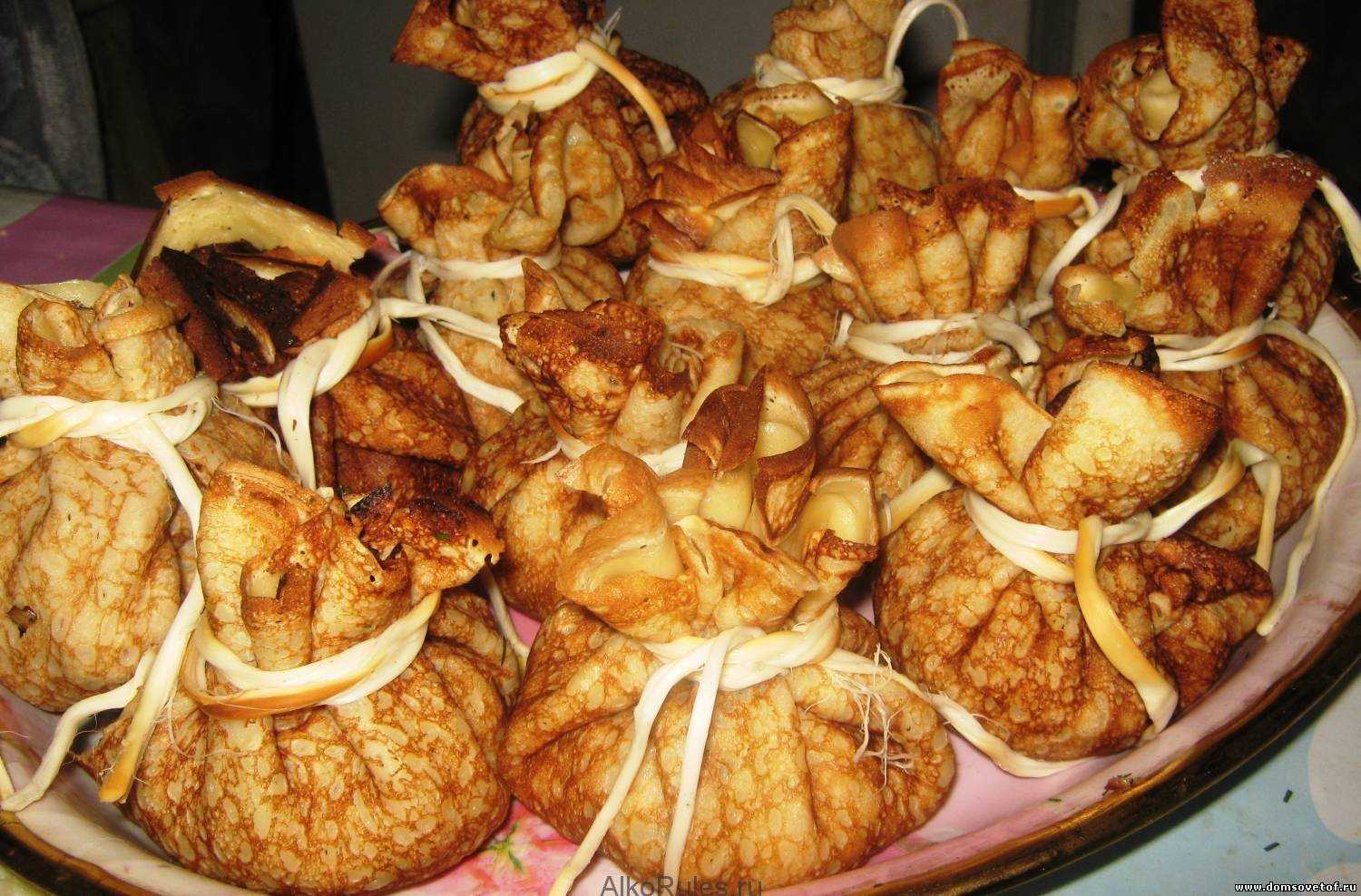 Отличный вариант блинной закуски – мешочки с начинкой из грибов, корейской моркови, мяса, ветчины с сыром, морепродуктов и т.д. Возьмите круглый блин, положите по его центру наполнение и соедините края. Для их скрепления вместо завязочки можно использовать стрелку зеленого лука или «жгутик» от сыра «косички».
