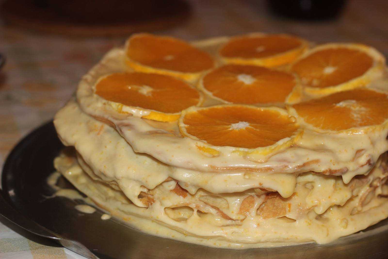 - Свободный блинчик свернуть в украшение, а затем его также промазать джемом и поместить на верхушку торта. Оставшиеся кусочки апельсина разложить сверху в качестве украшения.