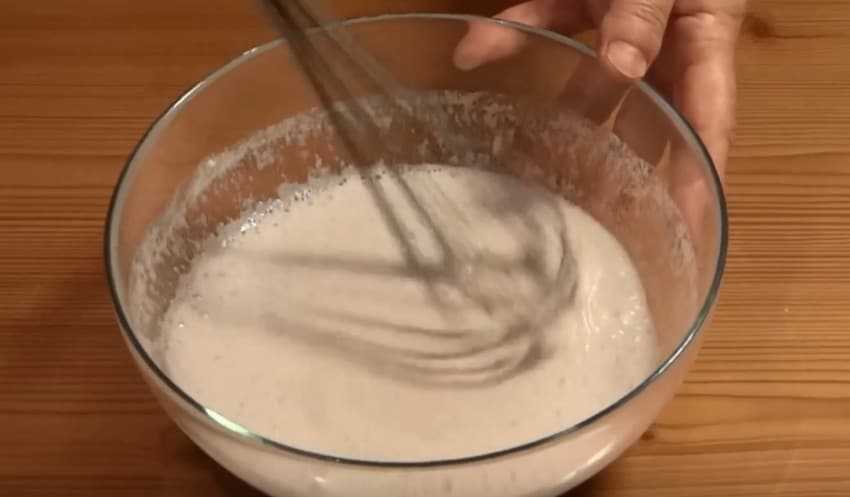 Алгоритм приготовления схож с классической рецептурой, но имеет небольшое отличие. Сначала готовите достаточно густое тесто, а затем постепенно вливаете жидкость, чтобы избежать появления комков.
