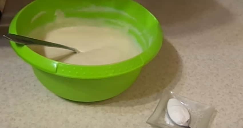 - В получившуюся смесь выливается сначала половина не холодного коровьего молока.