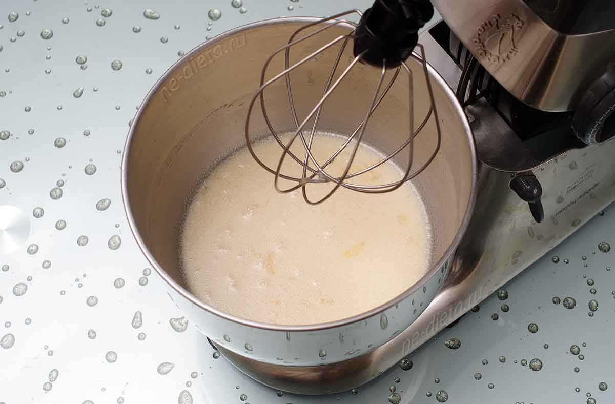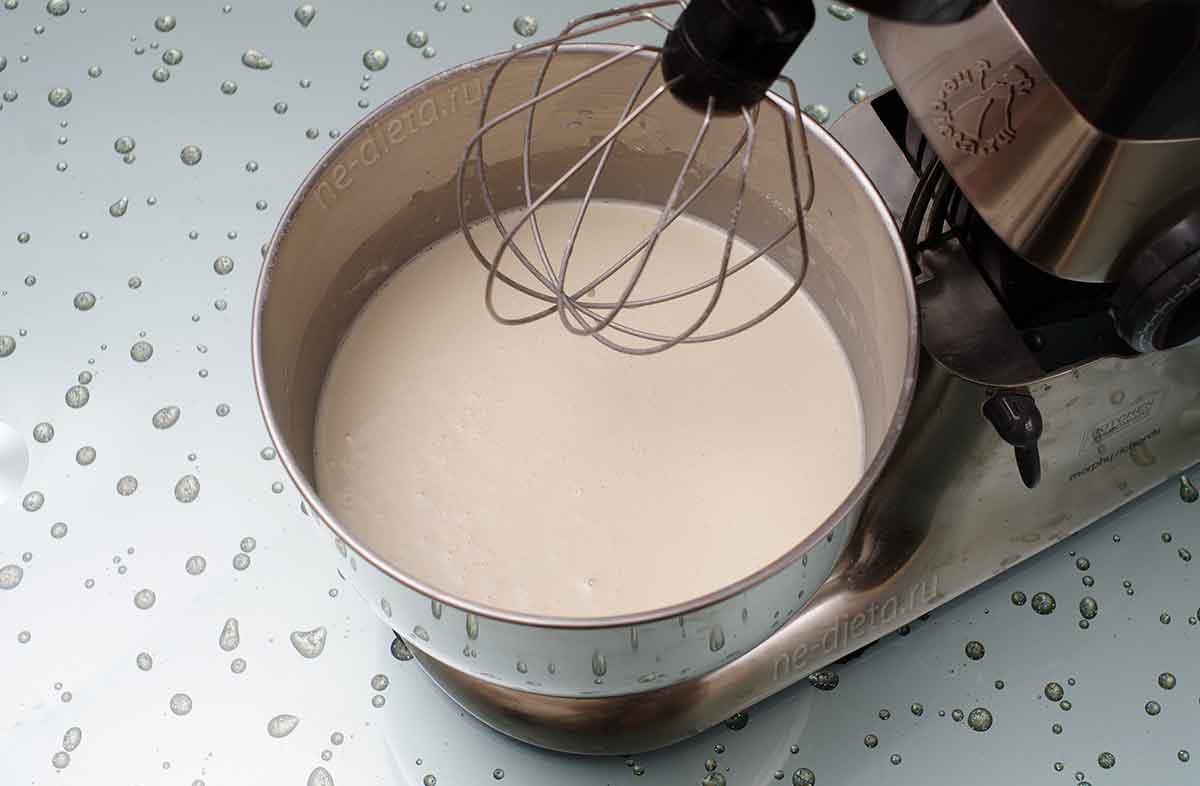 - Замесить тесто, сделав его однородным, без комочков. Разбавить тёплым молоком, перемешать. Можно это сделать при помощи миксера.