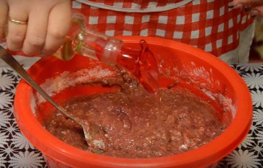 - В жидкий печеночный фарш добавляем сырые яйца (желтки отделять не нужно), муку, содовый разрыхлитель, манную крупу, мешаем до однородности.