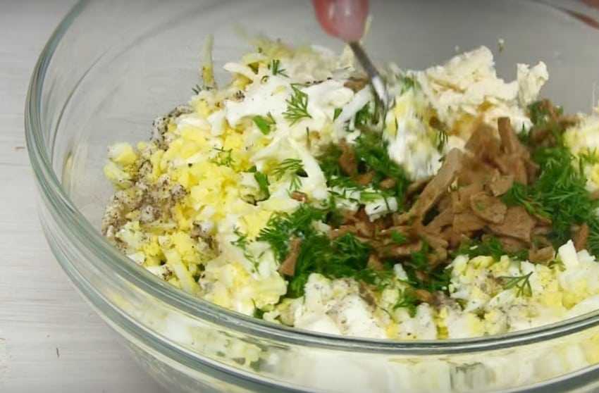 4. В это время можно приготовить начинку. На крупной терке натрите сваренные вкрутую яйца и плавленый сырок. Мелко нарежьте укроп. Заправьте сметаной или майонезом по вашему предпочтению. Если требуется, подсолите и поперчите.