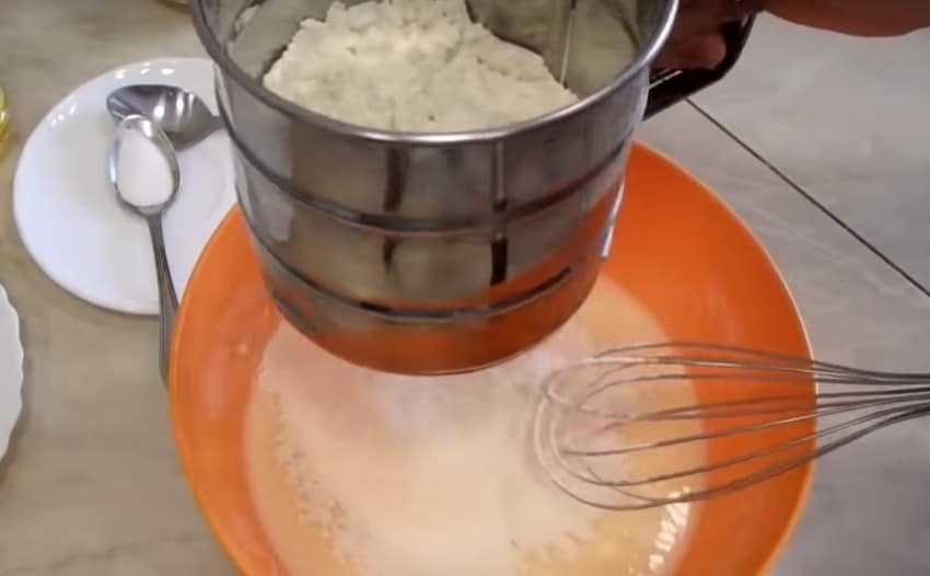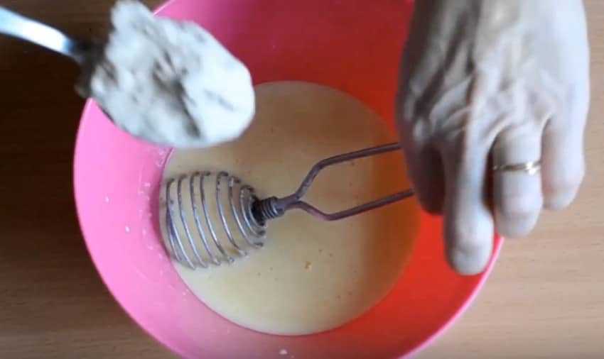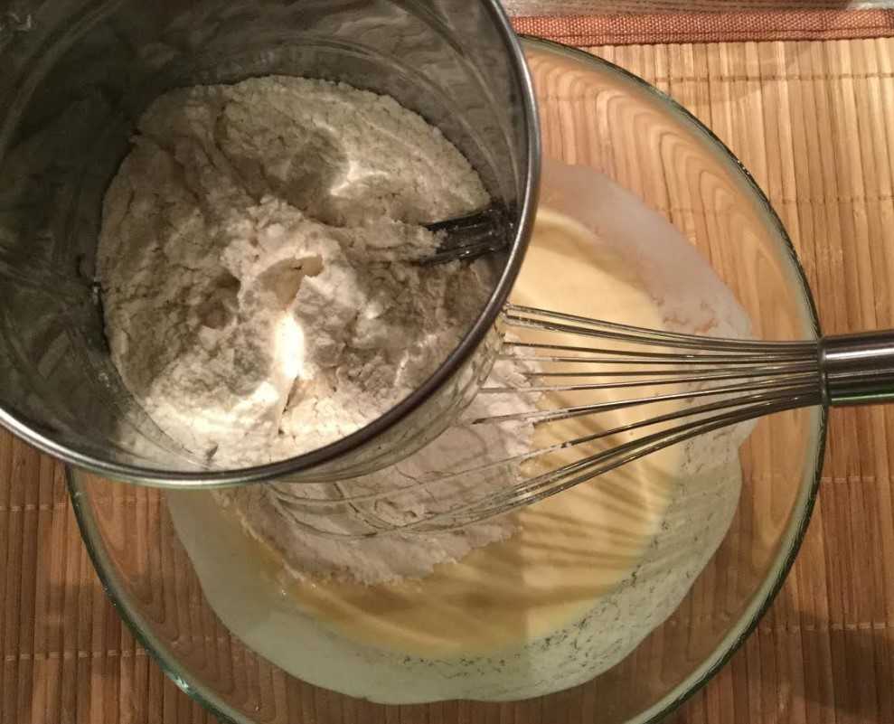 - После этого добавить муку по частям, продолжая интенсивно перемешивать венчиком. Никаких комочков не должно остаться.