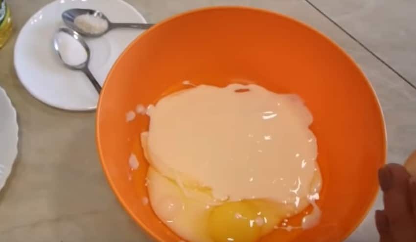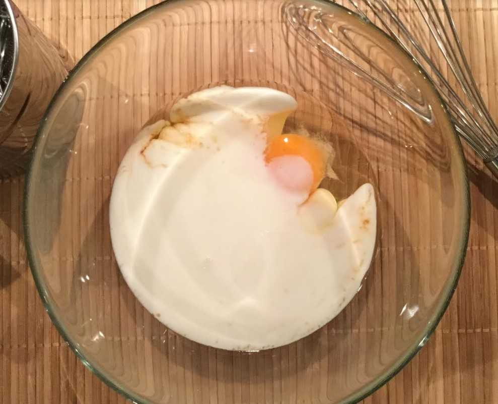 Первым делом в большую миску вылить весь йогурт. Затем сюда же вбить яйцо. Оно должно быть комнатной температуры.