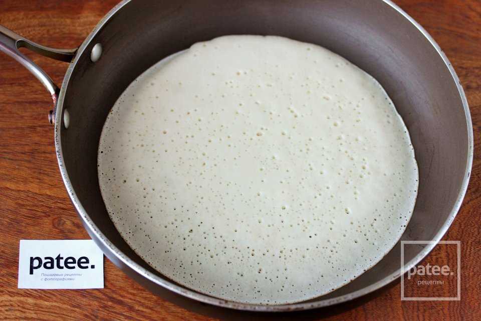 - Смазываем сковороду растительным маслом при помощи силиконовой кисточки и наливаем половину черпака теста. Распределяем все по сковороде и выпекаем блин в течение 1-2 минут до готовности (время может варьироваться).