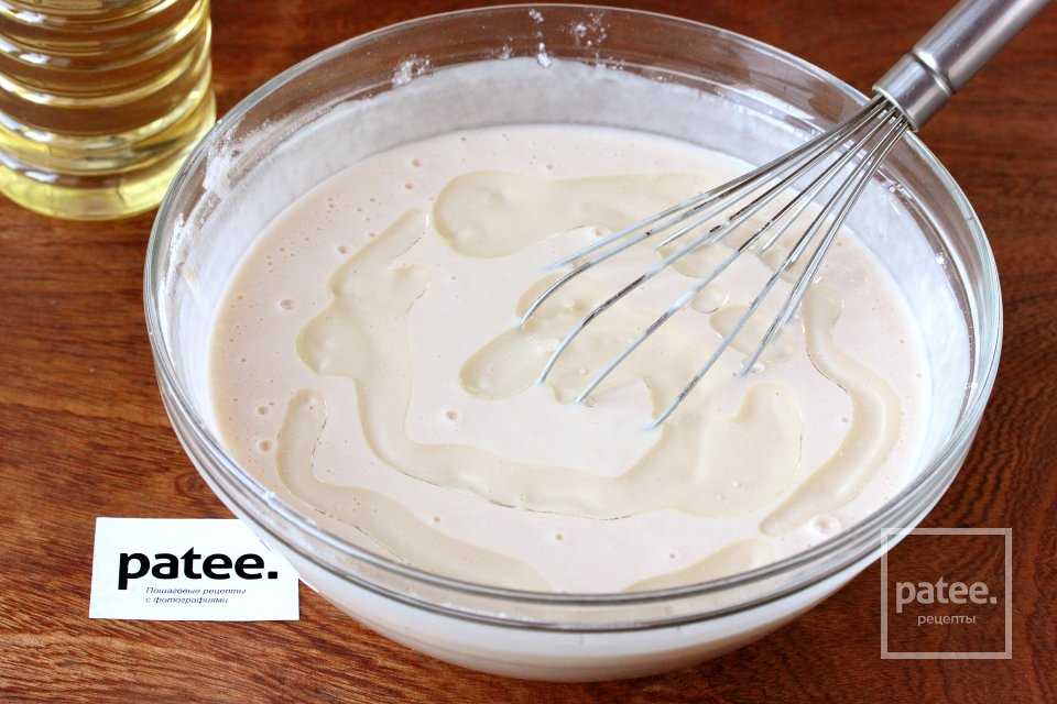 В жидкое тесто с мелкими пузыриками вливаем растительное масло и тщательно размешиваем.