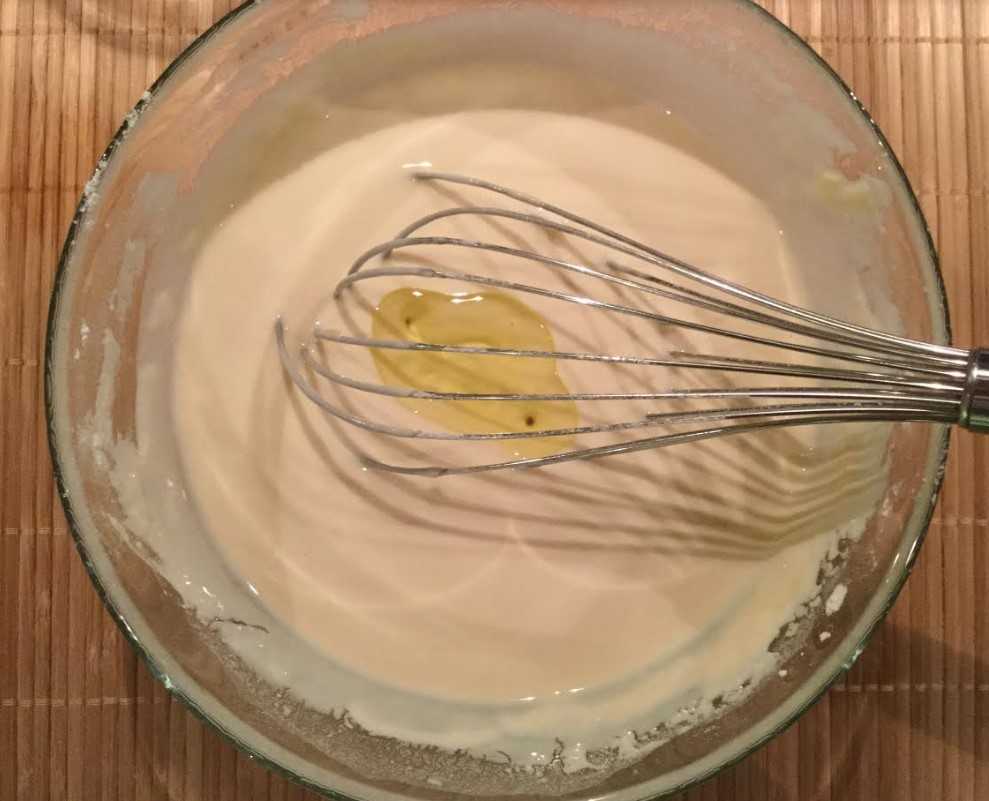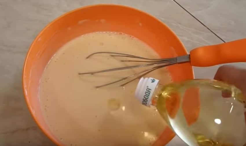 В самом конце налить указанное количество масла. При помощи венчика тщательно все взбить. Масса должна пениться немного.