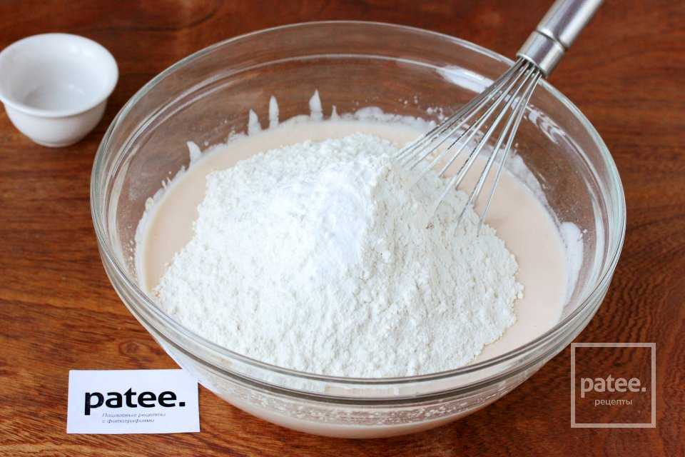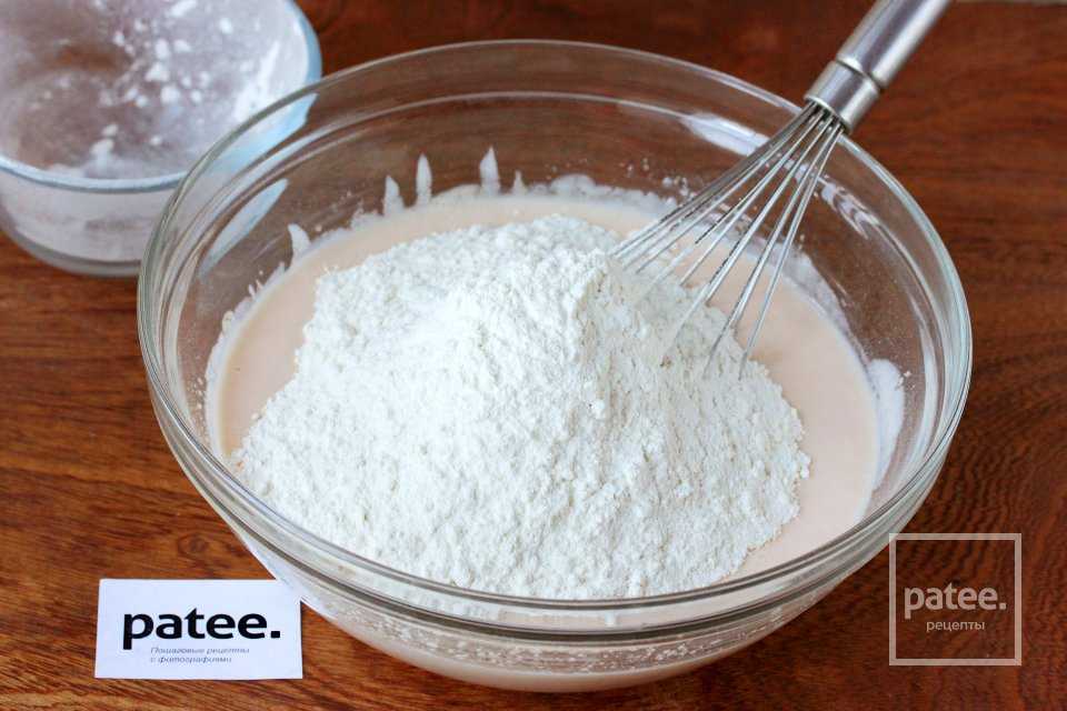 2. В жидкую основу просейте муку и еще раз вымешайте. Тесто должно получиться довольно густым, как на оладьи.