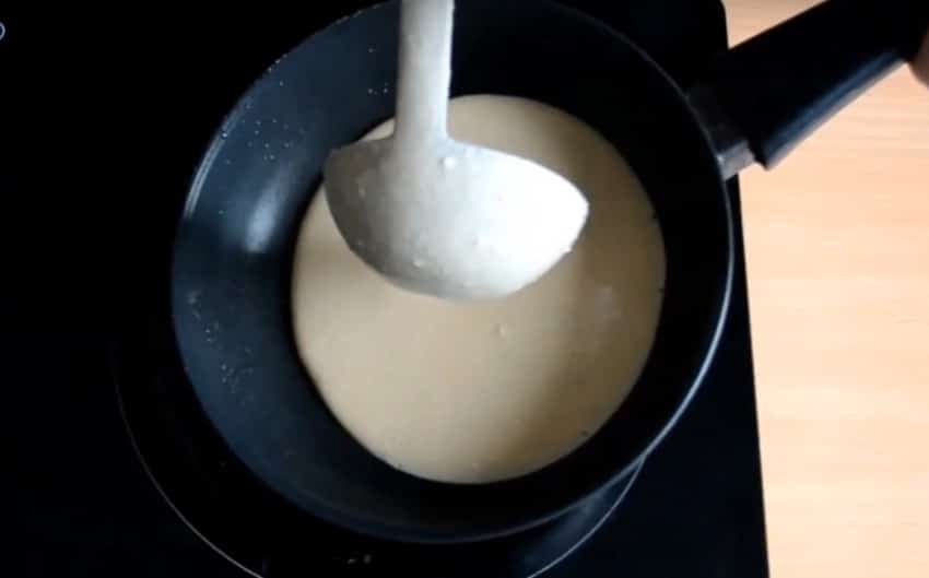 Ставим сковороду с небольшим количеством масла на средний огонь. Когда масло хорошо разогреется, с помощью черпака выливаем жидкое тесто в середину емкости. При этом одной рукой держим ручку сковороды и быстрыми круговыми движениями распределяем тесто по всей сковороде