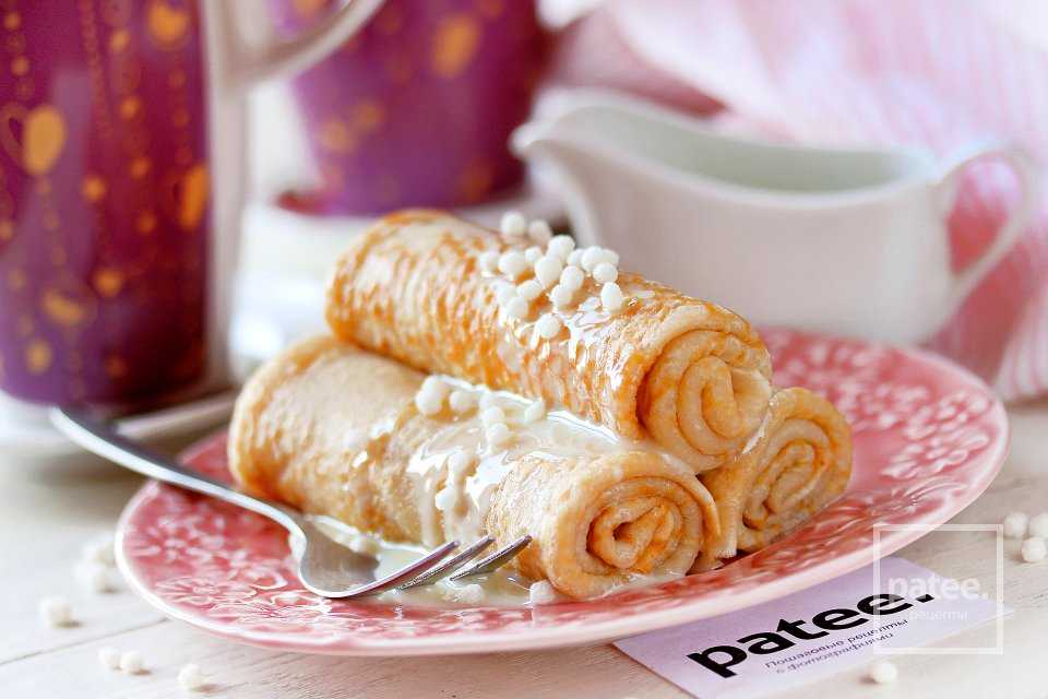 Сразу же после приготовления, пока наши блинчики еще теплые, блюдо можно подавать к столу. А вот с какими начинками угощать своих друзей и близких, это уже на ваше усмотрение. Для сладких блинчиков я обычно готовлю еще заварной крем и начиняю блюдо свежими ягодками вишни. Ну, а для соленых блинчиков моя детвора любит такую начинку, как вареное куриное филе, кусочки жареных грибов шампиньонов и тертый твердый сыр. Все эту красоту можно полить сгущенным молоком или сметаной соответственно. Хотя, блинчики получаются настолько вкусными, ароматными и нежными, что их можно и так кушать, запивая сладким черным чаем или кофе.