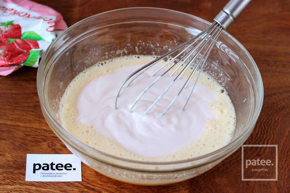 - Йогурт комнатной температуры сначала нужно смешать с двумя яйцами, они тоже должны сначала побыть в тепле. Сюда же нужно добавить соду, смешанную с уксусом, а также сахар. Посолить по вкусу и перемешать.