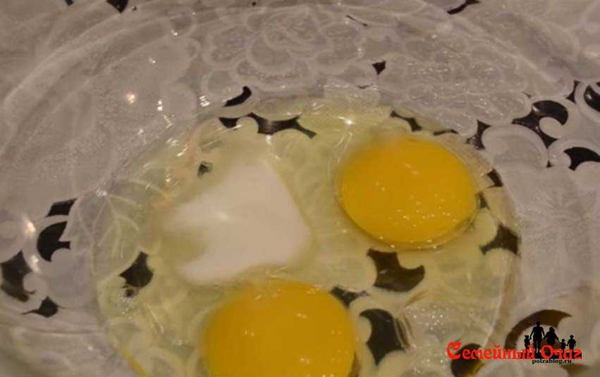 1. В миску для замеса теста разбить яйца. Достаньте их из холодильника заранее, чтобы они успели согреться. Если они мелкие, то возьмите их в количестве 4 штук. Добавить соль и сахар и сбить венчиком, или миксером до однородности.