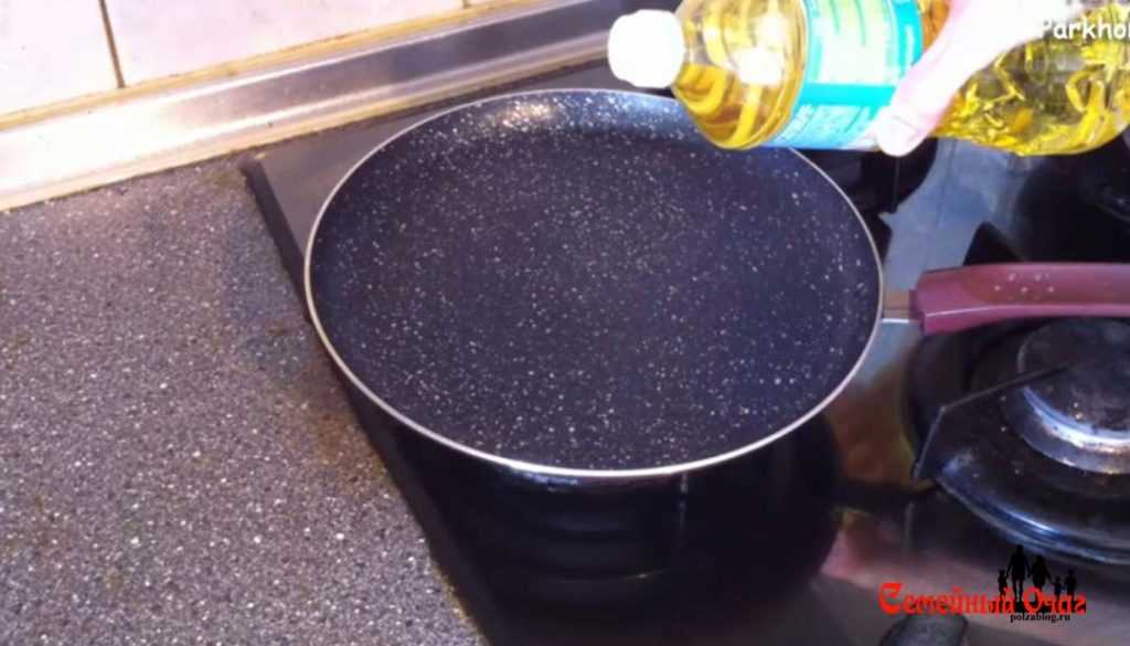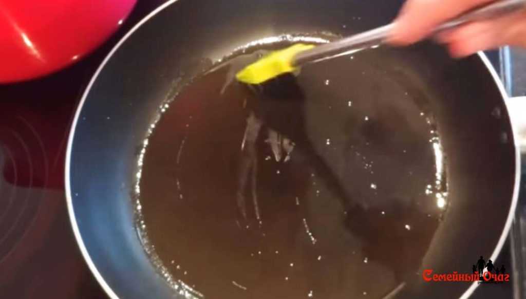 - Сковородку следует поставить на сильный огонь, смазать маслом и греть пока она не раскалится.