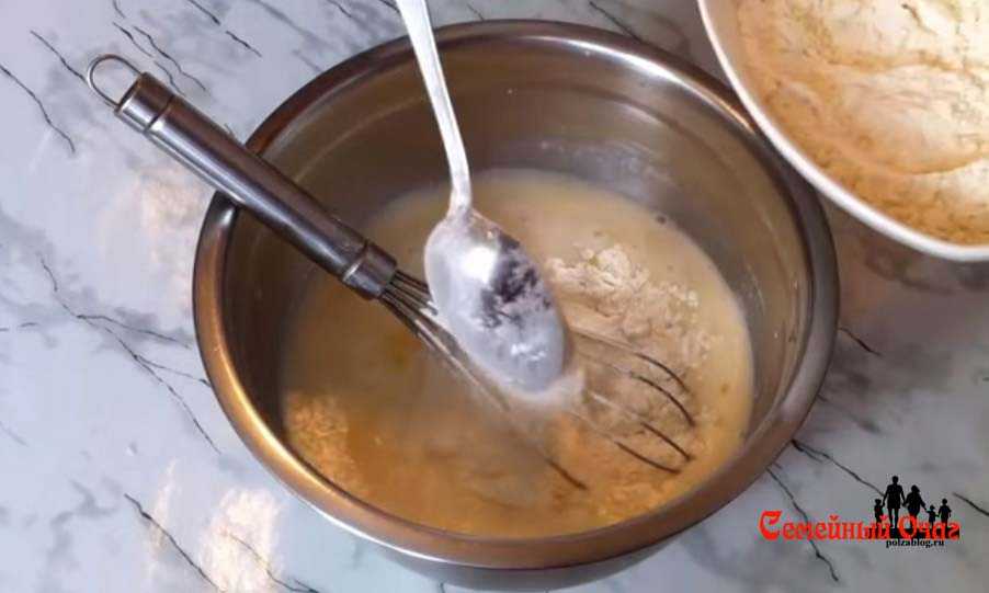 - Соединить два ингредиента в отдельной ёмкости (рюмке или пиале) и немедленно влить бурлящую смесь в тесто.