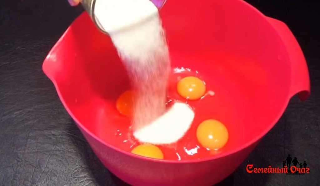 - В отдельную емкость вобьем яйца, добавим соль с сахарным песком и взобьем венчиком.