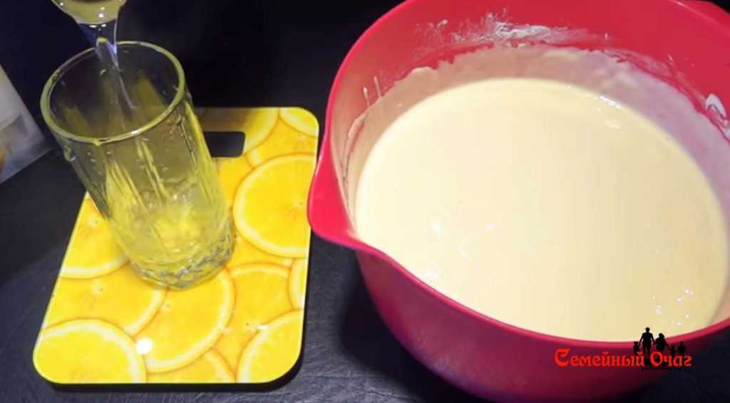 - В конце — насыпаем сахарный песок и вливаем растительное масло. Хорошо вымесим венчиком — тесто готово. Через четверть часа можно приступать к приготовлению.