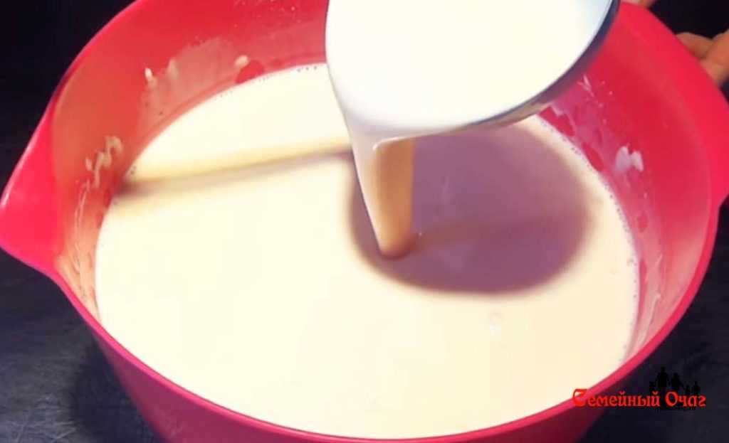 - Следом вливаем кефир, нагретый до комнатной температуры, не переставая работать венчиком.
