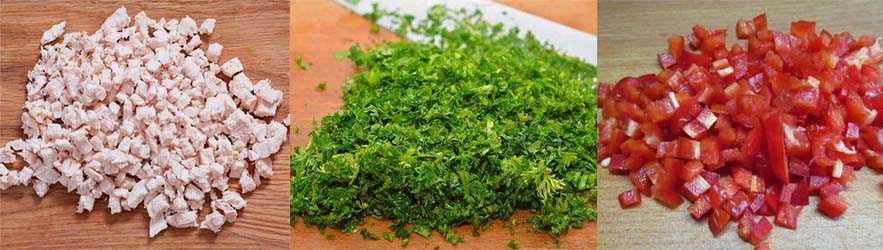 Перец, зелень и курицу мелко нарезать. Хорошо перемешать и посолить.