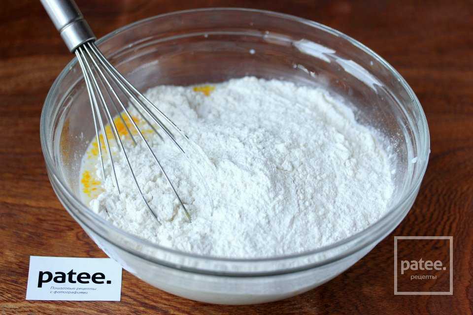 Для замеса теста начинайте всыпать в миску небольшими порциями пшеничную муку. Муку рекомендуется предварительно просеять, чтобы насытить кислородом. Сразу начинайте тщательно вмешивать муку в молочно-яичную смесь, чтобы избежать образования тестяных комочков.