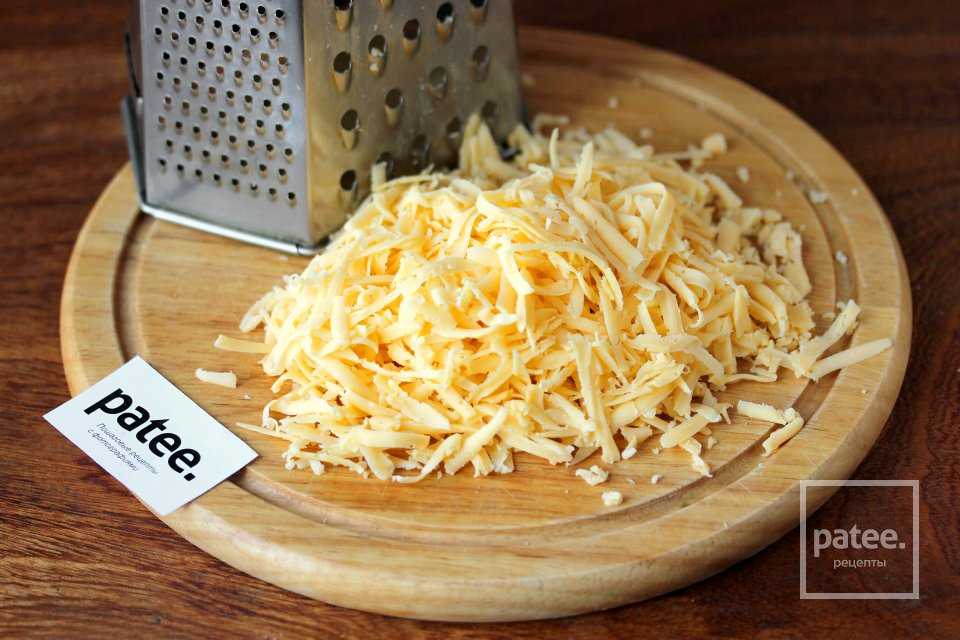 Натираем на крупной терке сыр. Сыр подойдет любой, который плавится.