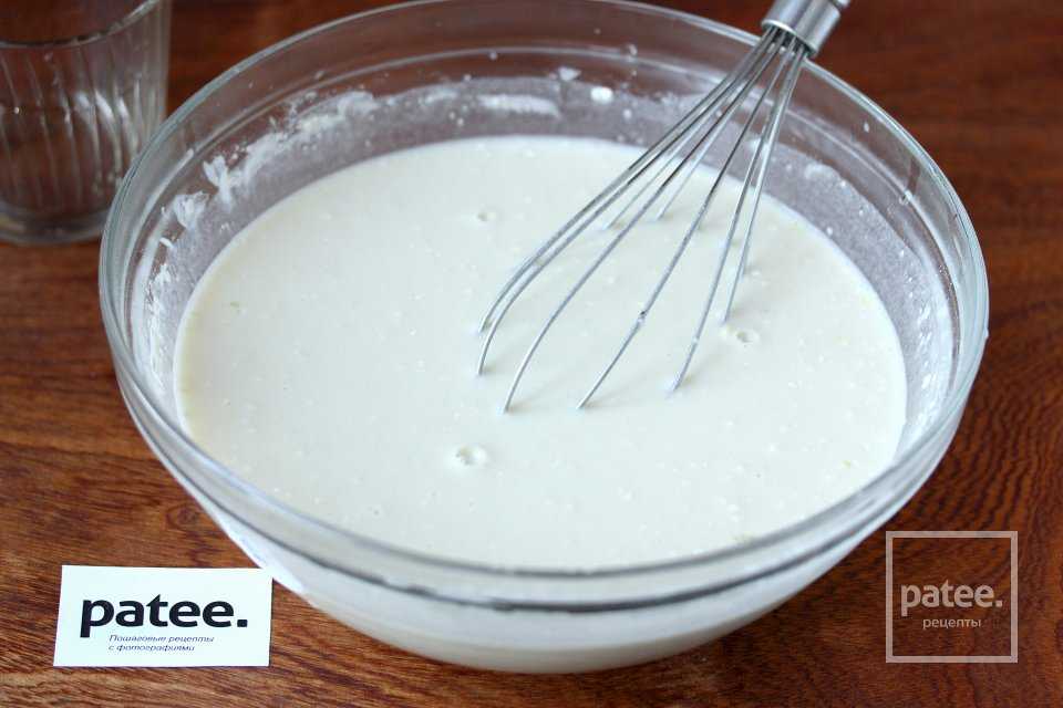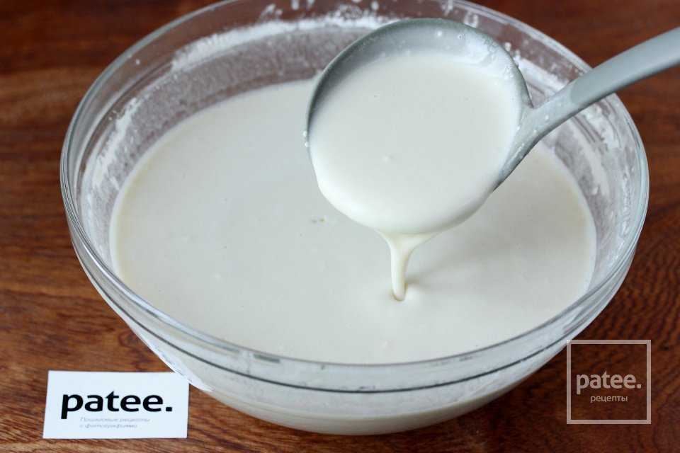 Тесто должно получиться примерно, как жирные сливки. Если оно получилось слегка густоватым, я добавляю обычно немного молока или воды, если жидкое – немного муки.