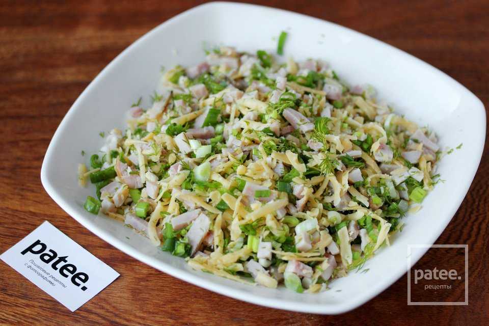 - Твердый сыр измельчается с помощью крупной терки, а ветчина режется на небольшие кубики.