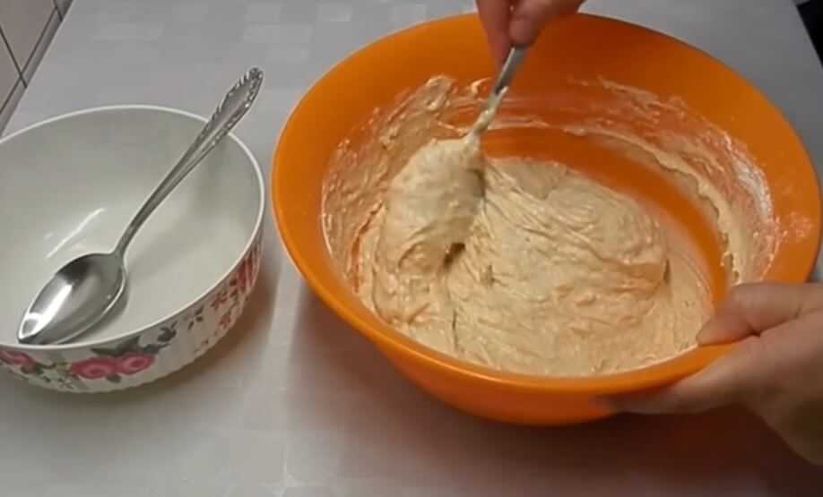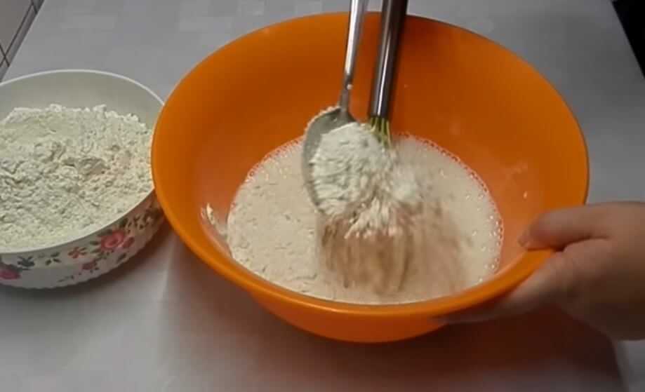 Вводим просеянную муку и замешиваем густое тесто. Для того, чтобы оладьи получились пышными, можно добавить небольшое количество разрыхлителя или гашеной соды.