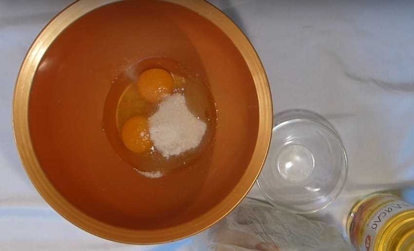 - В отдельной емкости разбиваем яйца, добавляем соль и сахар.