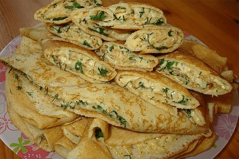 В Белоруссии очень популярны блины с начинкой из зеленого лука и яиц. Причем, они добавляют туда разные специи. Еще там любят блины с грибами и картофелем и луком.