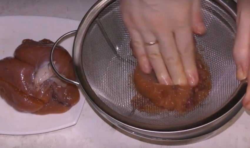 После промывки икра размером и цветом похожа на пшённую крупу. Её откидывают на сито или подвешивают в мешочке до полного стечения капель воды.