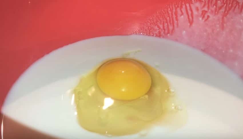 1. Выбейте в миску яйца, хорошо взболтайте венчиком, добавьте молоко и еще раз перемешайте.