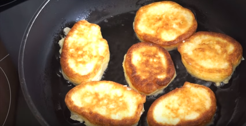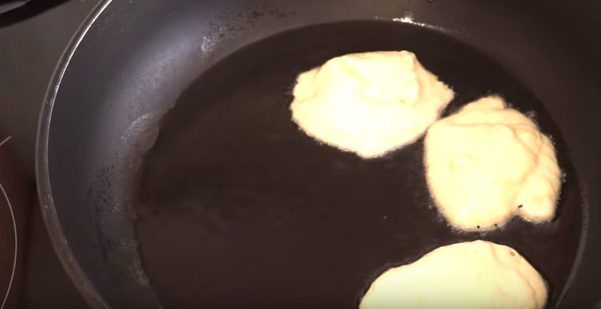 - На сковороду наливаем 150 мл растительного масла и разогреваем. Огонь выставляем меньше среднего. Ложкой, смоченной в масле, выкладываем тесто. Накрываем сковороду крышкой и готовим 2-3 мин. Переворачиваем на другую сторону, снова закрываем крышкой и жарим до готовности.