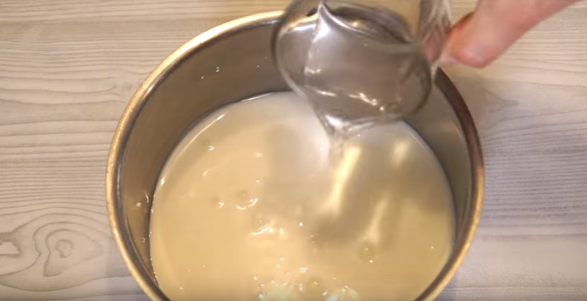 1. Выливаем кефир в кастрюлю, добавляем 40 мл воды и ставим на средний огонь, чтобы немного подогреть.