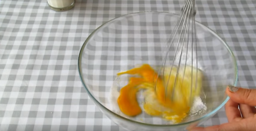 1. Первым шагом нужно разбить три яйца, затем положить сахар и соль. Перемешайте и дальше внесите соду. Все продукты взбейте миксером до растворения сахара.