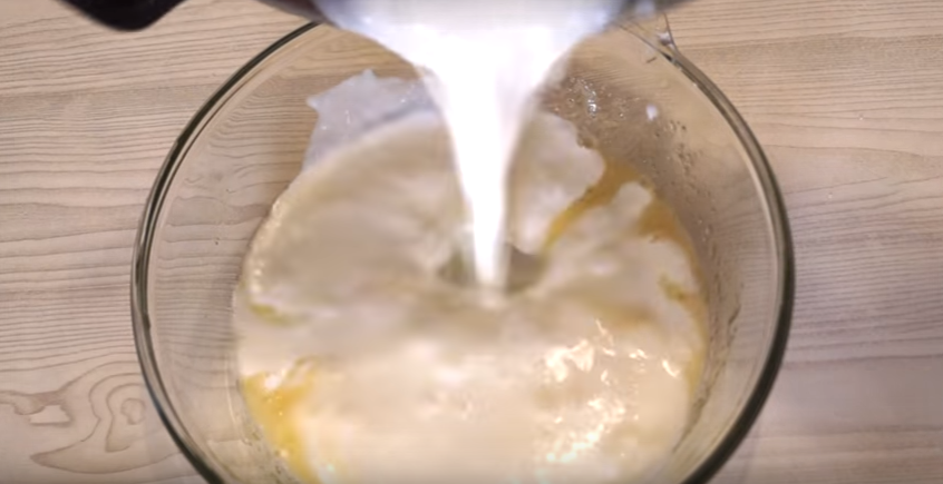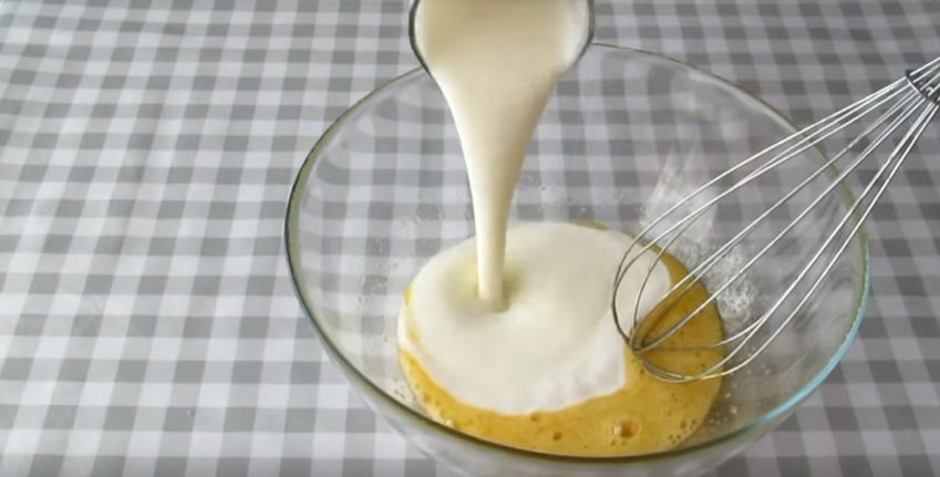 3. Подогретый (но, ни в коем случае, не горячий) кефир вливаем в яичную смесь и тщательно перемешиваем до появления пузырьков воздуха на поверхности.