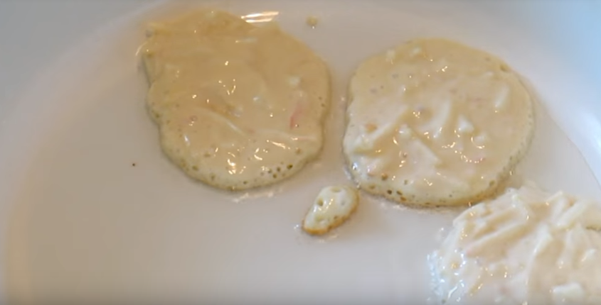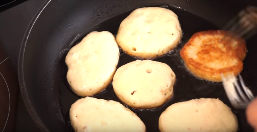 3. Жарьте на разогретой сковороде с растительным маслом, в момент жарки огонь сделайте на средний. Жарьте при закрытой крышке. Как только начнут появляться пузырьки, следует перевернуть оладушек на другую сторону.