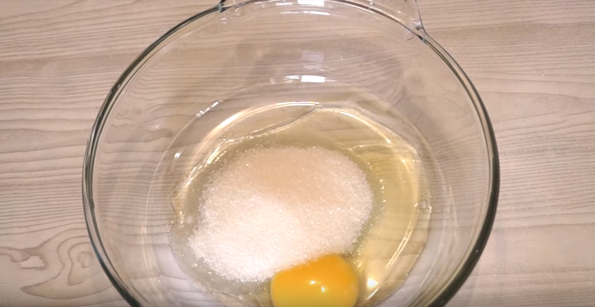 1. В глубокую миску разбиваем яйцо, добавляем соль и сахар. Взбиваем венчиком.