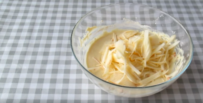 4. Берем яблоки и натираем их на крупной терке прямо в тесто. Очищать их от кожуры или нет решайте сами, это не принципиально.