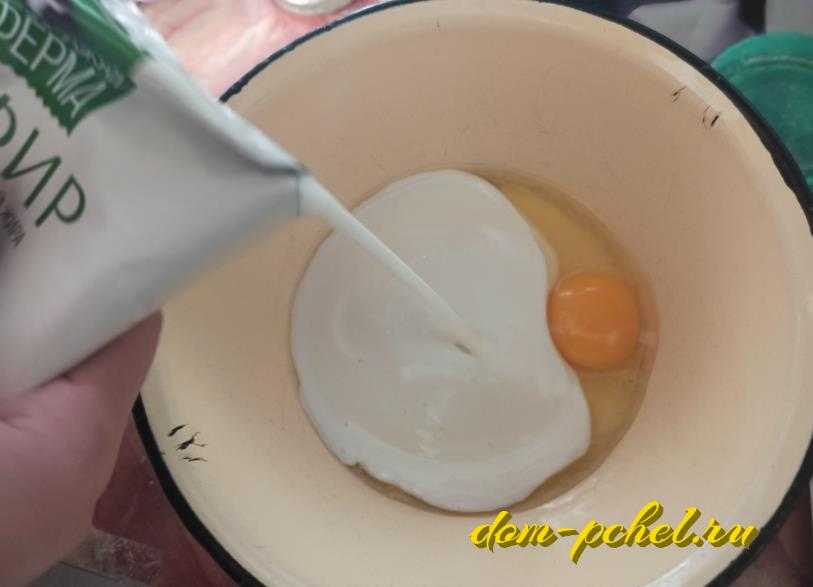 - Затем в кефир добавляют дрожжи совместно с сахаром. Хорошо перемешивают и отставляют в тепле для процесса брожения.